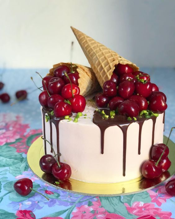 Сладкий тортик украшенный вишневым рожком, и вкуснейшей глазурью.